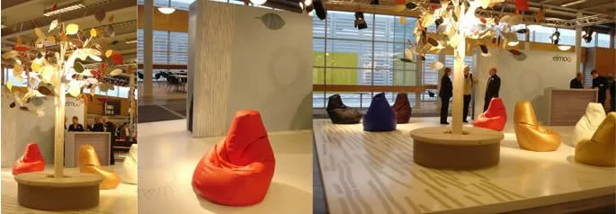 The leather was made into beansacks, and designs from the collection formed a backdrop for the walls and floor. A tree with leather leaves displayed the full range of colours and qualities, demonstrating the wealth of potential this exquisite upholstery leather represents.